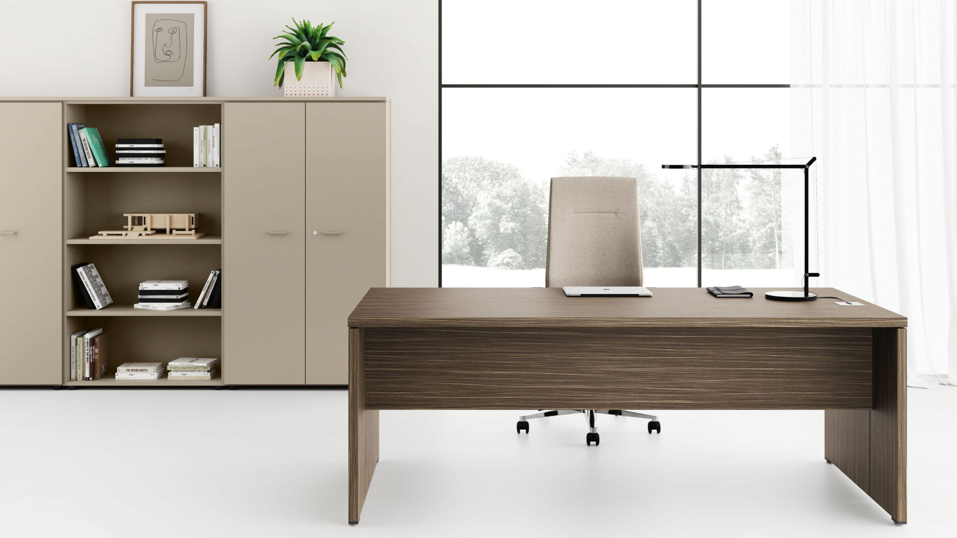 Una scrivania direzionale interamente in legno, con e senza allungo, dalle linee nette e decise. Un avvicendamento di pannelli da 35 mm che si avvicinano senza toccarsi.
